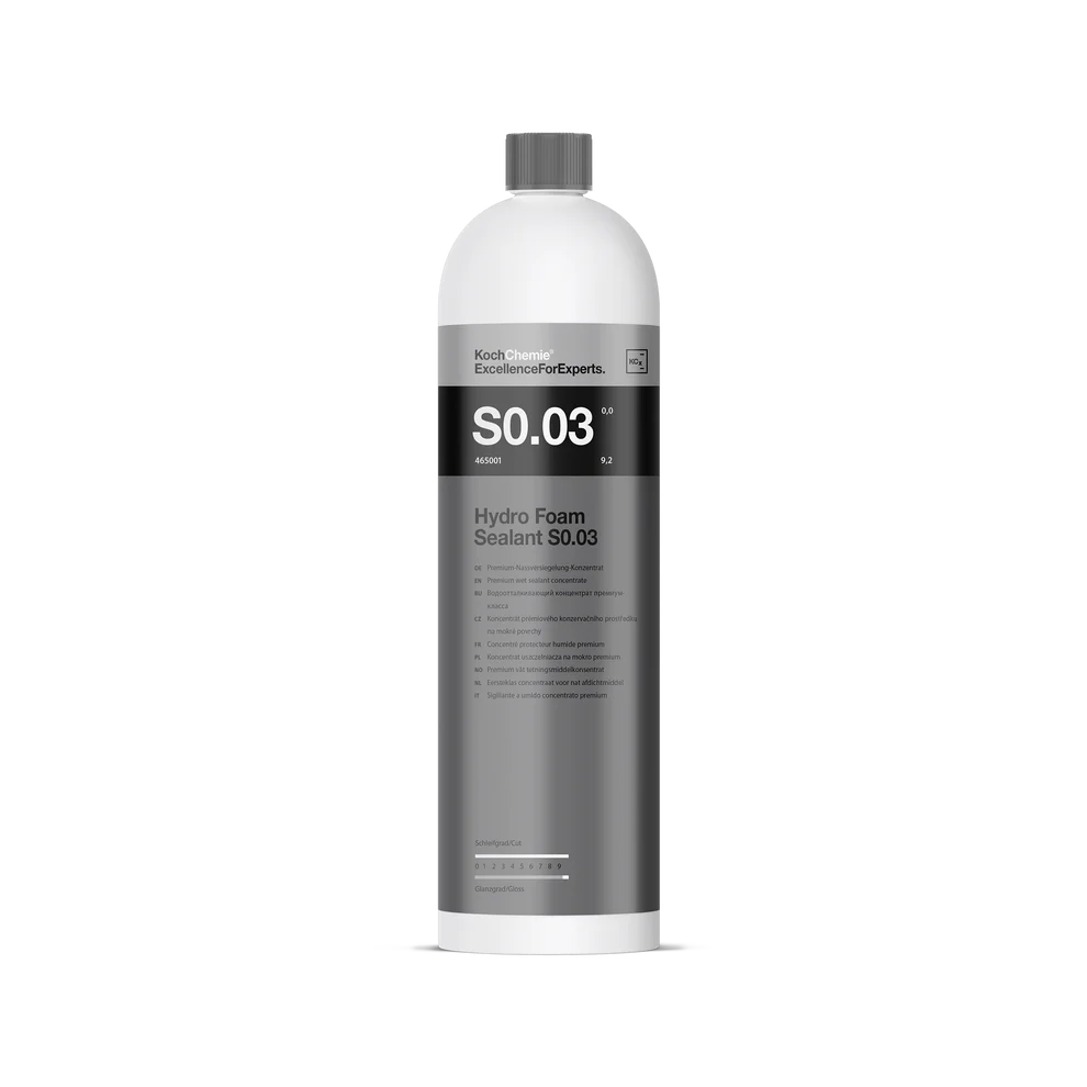 Koch-Chemie Hydro Foam Sealant S0.03 är en premium våtförsegling som ger en hydrofob yta (lack, glas och plast) och sammetslen mjuk känsla. Högblanka tillsatser i kombination med de högkvalitativa vårdkomponenterna ger en extrem djupglans (lack) och förhindrar blekning och försprödning av plastdelar och impregnerar cabriolet-tak. Vid regn säkerställer den också god sikt genom ett snabbt dropp på glasytor. Den fruktiga körsbärsdoften ger en intensiv doftupplevelse. Regelbunden användning bidrar avsevärt till att bibehålla fordonets värde.